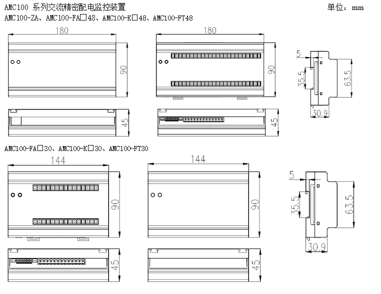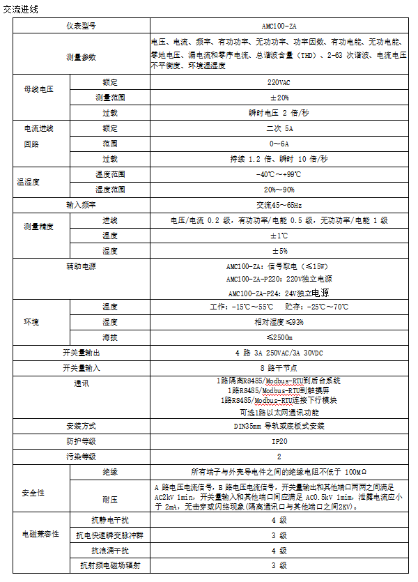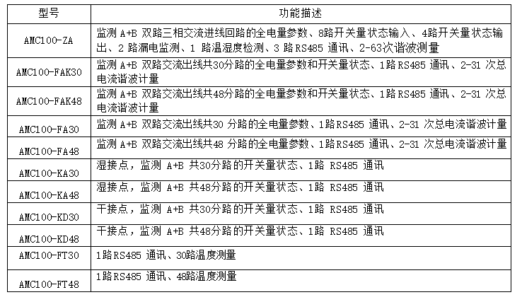監測 A+B 雙路三相交流進線回路的全電量參數、8路開關量狀態輸入、4路開關量狀態輸出、2 路漏電監測、1 路溫濕度檢測、3 路 RS485 通訊、2-63次諧波測量