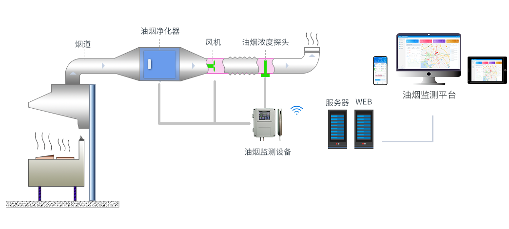 基于互聯網+技術的餐飲油煙在線監控系統可實時監測餐飲企業排放的油煙濃度、現場油煙凈化器、風機的開關狀態及凈化器清潔度等指標;可查詢、統計不同階段的油煙濃度排放監測情況,并可以結合GIS實現污染準確定位;可有效解決環保部門對油煙濃度排放情況的監測,同時也解決了對餐飲企業的油煙凈化器的開關狀態、凈化器清潔度以及風機開關狀態等監控難的問題,為餐飲企業長效管理提供平臺支持,可提高環境管理能力和監督執法水平。結合APP應用的移動終端和便攜油煙檢測設備,可實現餐飲油煙排放的現場取證、測量、執法,實現對餐飲油煙的區域整體監控、預警、信息管理及現場移動執法檢查,使餐飲油煙的排放管理具備系統實施方案。
