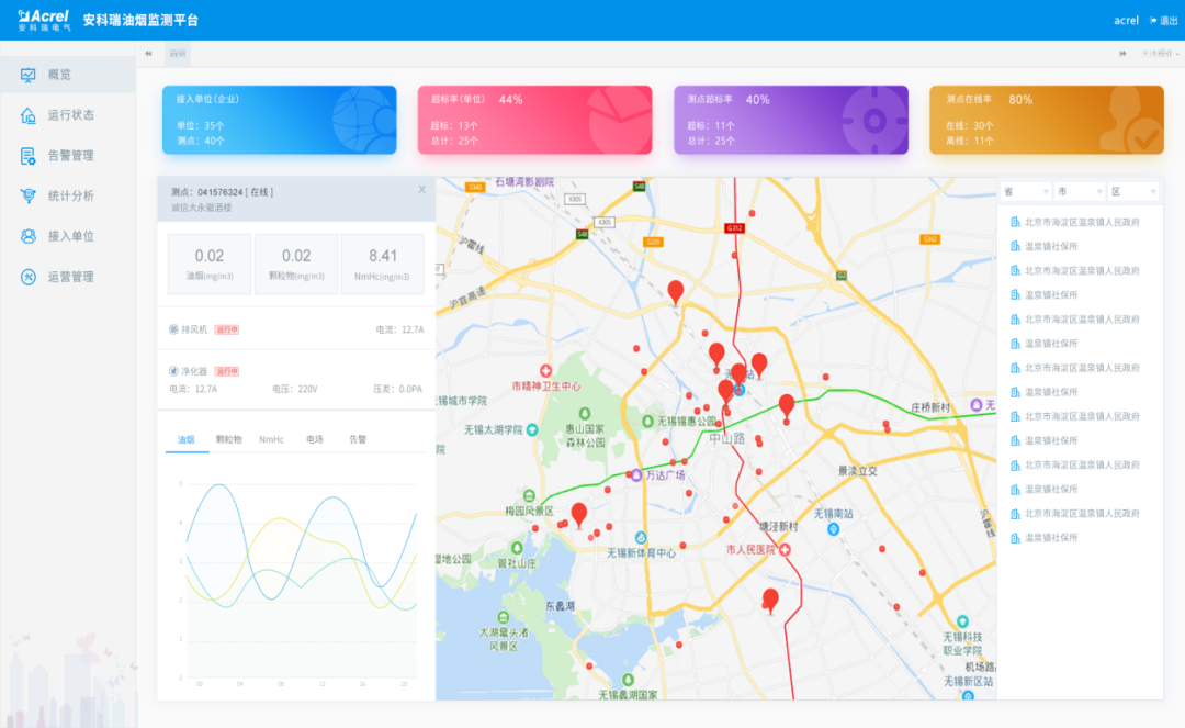 整體監控解決了餐飲企業眾多且分散不能及時統計排放濃度、凈化器清潔度、排放過程是否進行凈化處理等關鍵信息的難題。該平臺解決了上述難題,可實行整體實時監控,提高了監控頻次,降低了人力物力成本。