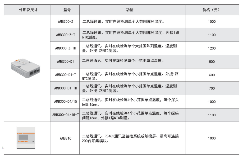 是一款非接觸式紅外測溫裝置。型號AMB300-Z:二總線通訊;實時在線監測單個大范圍陣列溫度;型號AMB300-Z-T:實時在線監測單個大范圍陣列溫度,外接一路NTC測溫;型號AMB300-Z-TH:實時在線監測單個大范圍陣列溫度,濕度 測量,外接一路NTC測溫;
