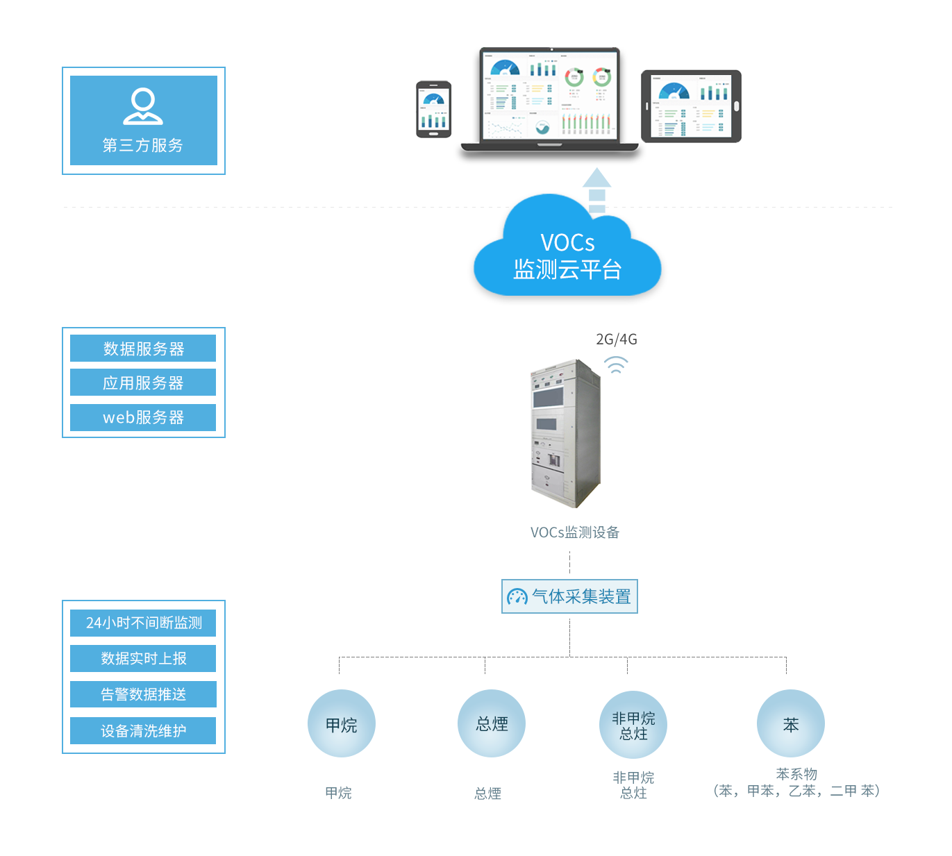 (一)在線監測 對VOCs數據的監測,包括甲烷,非甲烷總烴,苯系物,煙氣溫度、壓力和流速等數值采集監測;