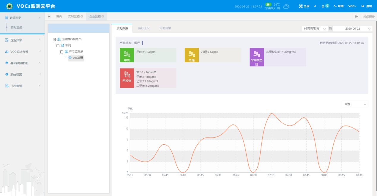 現場安裝監測終端,持續監測Vocs探測儀的工作狀態,同時結合排放口的揮發性物質、顆粒物濃度等進行對比分析,一旦排放超 標,系統會發出異常信號。