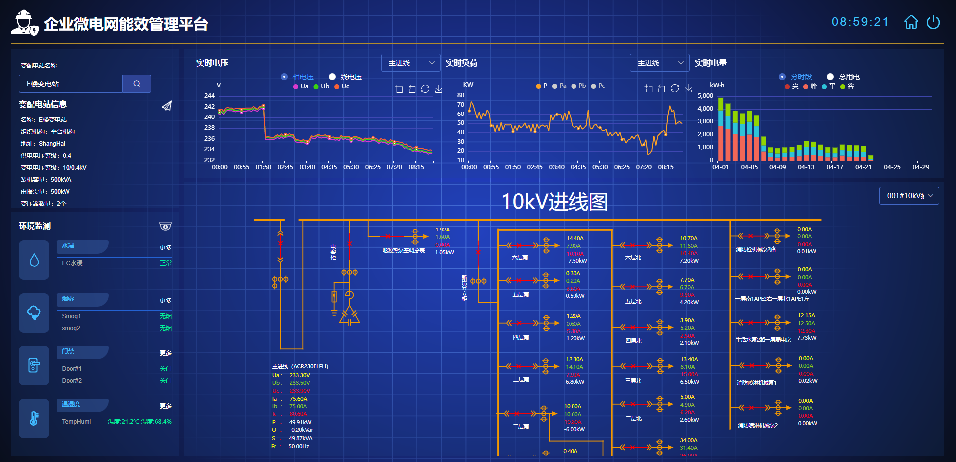 可對配電系統(tǒng)回路的漏電電流和線纜溫度進行實時監(jiān)測,實現(xiàn)安全預警。 另外還可以接入消防設備電源監(jiān)控系統(tǒng)、防火門監(jiān)控系統(tǒng)、應急照明及疏散指示系統(tǒng)的報警信息。平臺可實時監(jiān)測配電系統(tǒng)的諧波畸變、電壓波動、閃變和容忍度指標分析配電系統(tǒng)的電能質量。