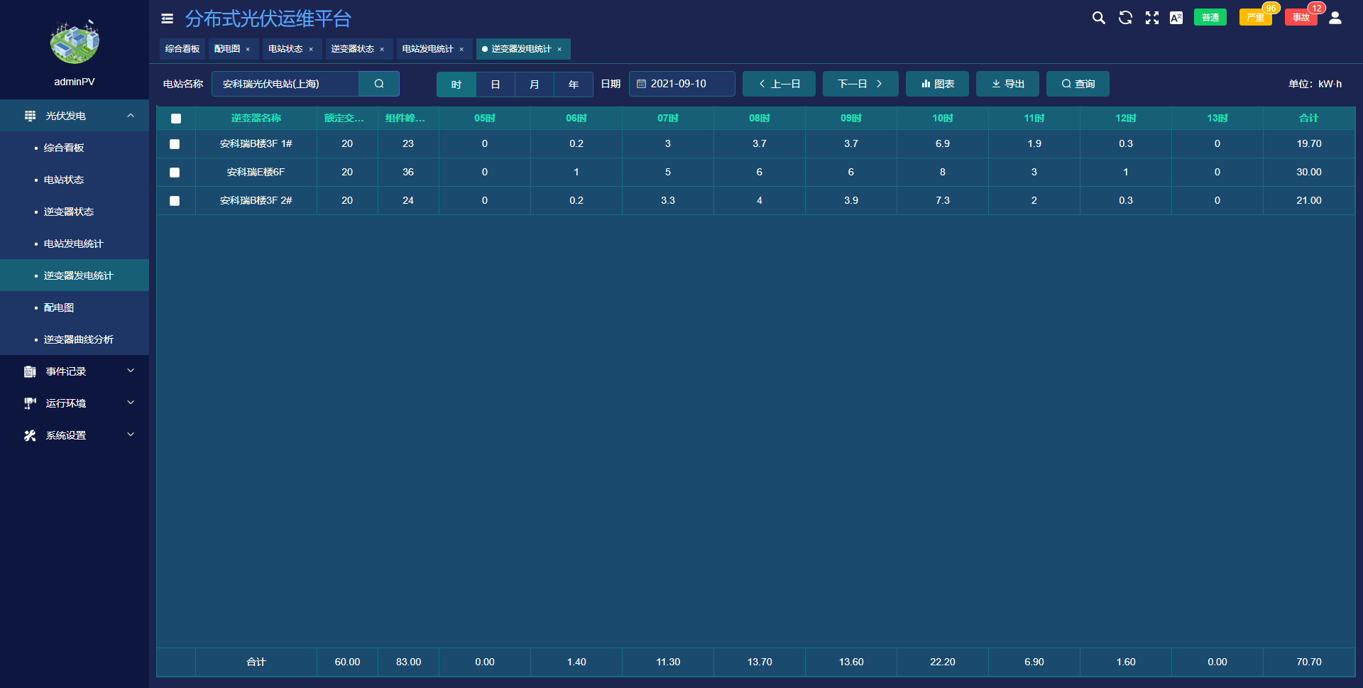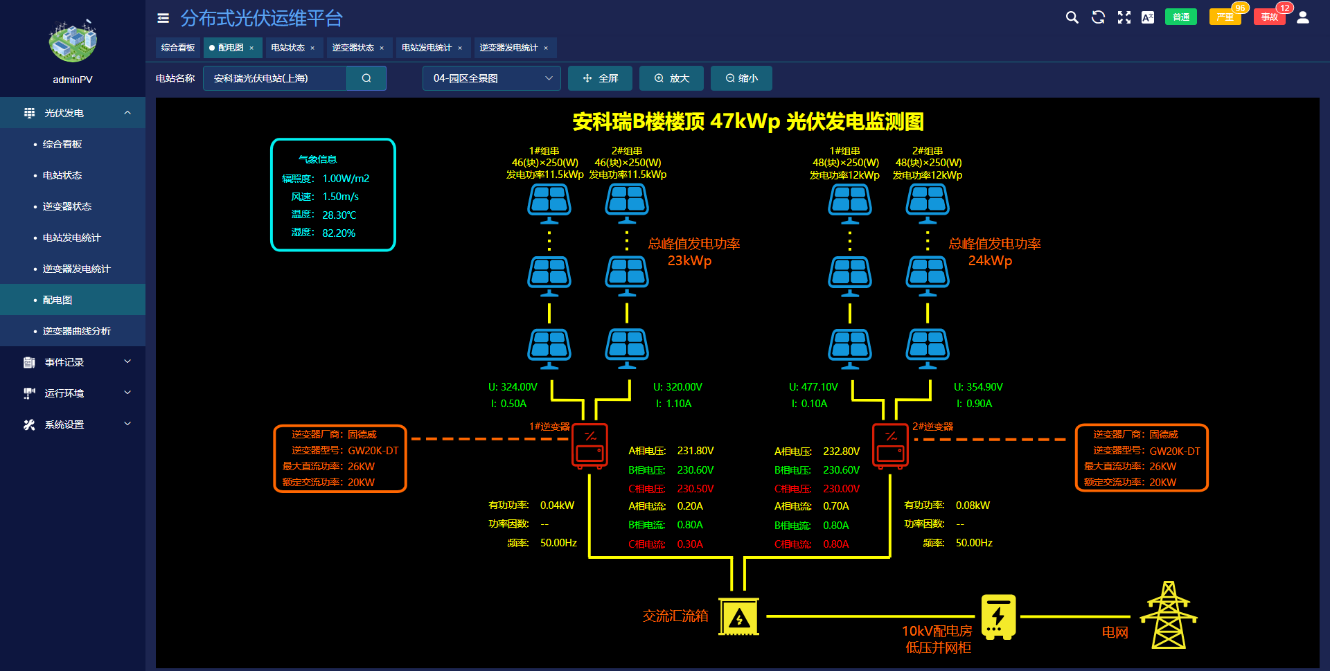顯示所有光伏電站的數量,裝機容量,實時發電功率。
