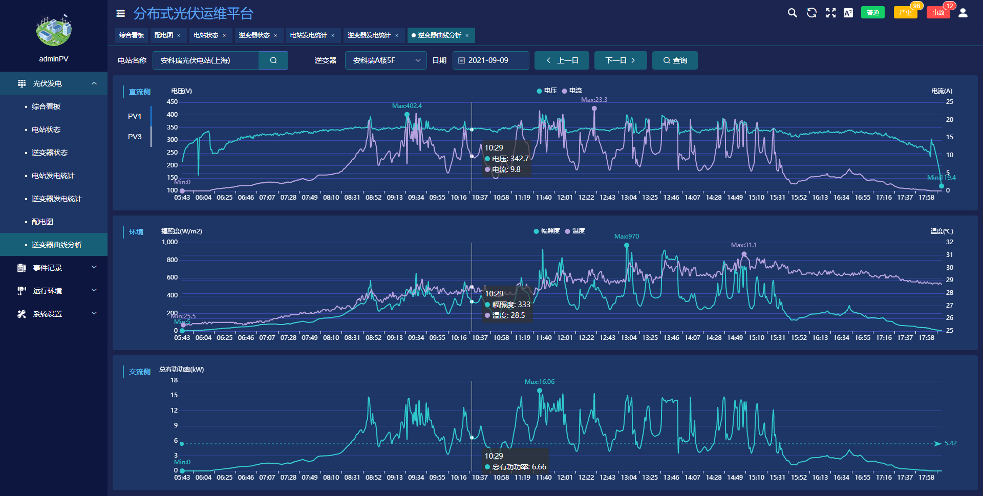 通過曲線圖顯示逆變器功率、環境輻照度曲線。