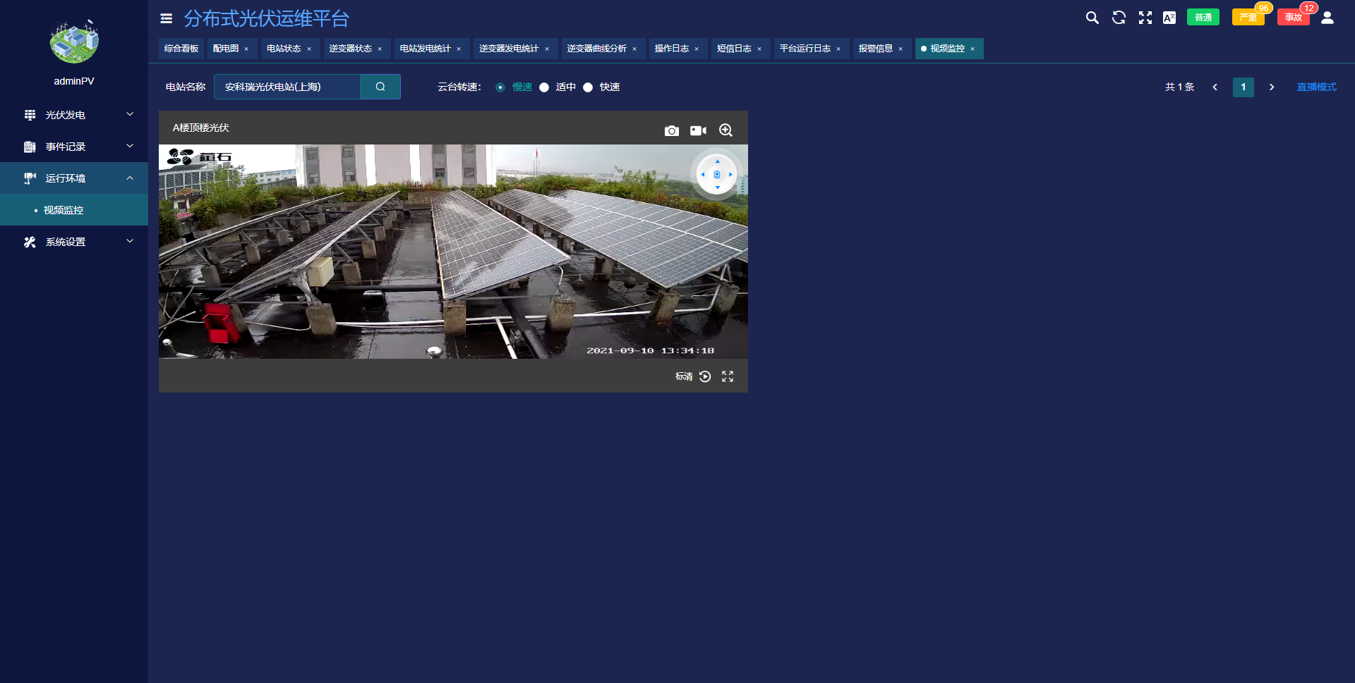 通過安裝在現場的視頻攝像頭,可以實時監視光伏站運行情況。對于有硬件條件的攝像頭,還支持錄像回放以及云臺控制功能。如圖所示。